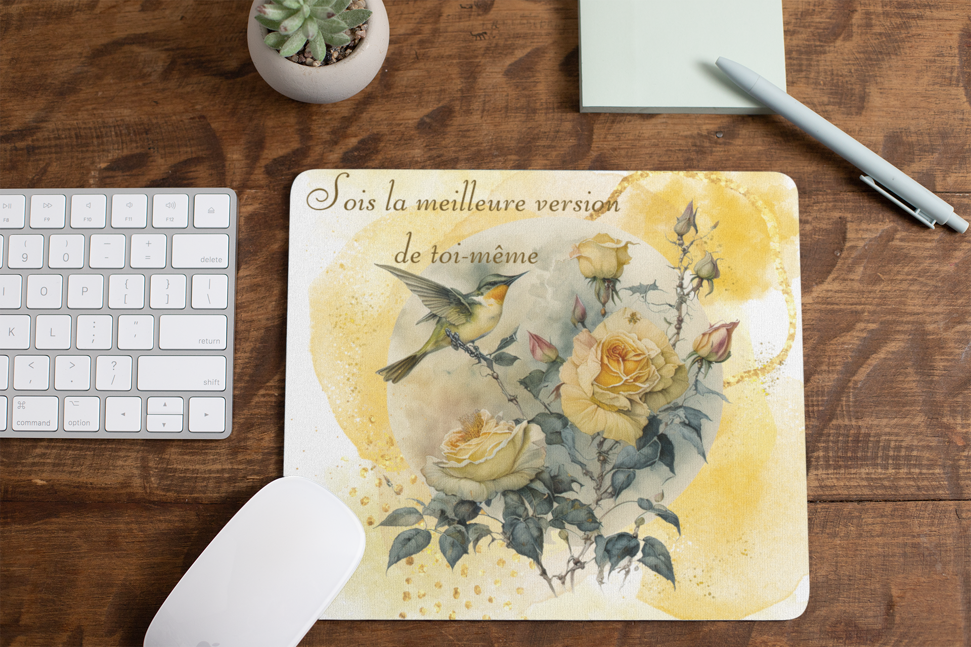 Fabriqué à partir de matériaux doux et tactiles, ce tapis de souris offre une expérience confortable avec un bel imprimé contenant des fleurs, un joli colibri et une citation inspirante : Sois la meilleure version de toi-même.